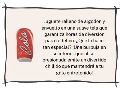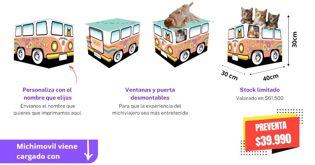 Es una caja de cartón microcorrugado sólido, que destaca por un diseño inspirado en los años 70; full impresa en alta definición con colores vibrantes y un decorado exquisito. Trae ventanas y puerta desmontables para que su gato interactue y juegue con ella.